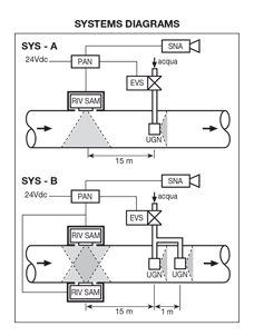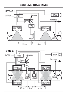 The “B” type is the large simple system, suitable for “large” ducts, with diameter up to one meter. It comprises two detectors and two spray nozzles.