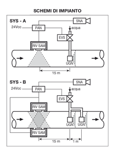Il tipo “A” è il sistema semplice piccolo, adatto per tubazioni ‘piccole’, con diametro fino a mezzo metro. Comprende un solo rivelatore e un solo ugello spruzzatore.